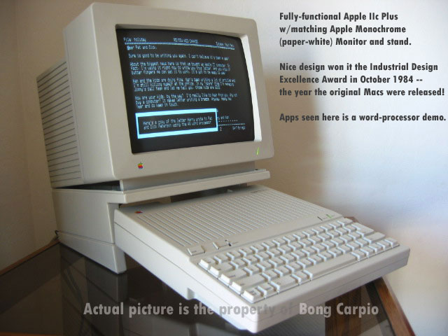 Apple IIc Plus (with matching Apple Monochrome Display & stand): Among the last models in the legendary Apple II series, the Apple IIc Plus was the fastest Apple II that was ever released. Powered by a MOS 65C02 chip clocked at 4 MHz, it was 4X faster than the original Apple II computer that helped Apple Computer become one of America's top, mainstream computer company. Officially launched in September 1988 - a time when Apple engineers were already obsessed in making enhancements to their Macintosh series - the Apple IIc Plus was Apple's last computer that still used a non-graphical user interface (ProDos/AppleDOS 3.1). It was actually an enhancement of the original Apple IIc that the company originally released in 1984 which, coincidentally, was also the year they released the original Macintosh. It came with a then, de-facto 3.5", 800k diskette drive instead of the older 5.25" ones, as well as a built-in power supply - unlike the original Apple IIc that came with a bulky, 12V power brick. A notable feature was the "keyboard button", which toggled the keyboard between 'QWERTY' and the DVORAK layout. The latter was named for its inventor, Dr. August Dvorak, who designed it with the goal of maximizing typing efficiency. It was also the beautiful design that made the Apple IIc -as well as the enhanced Apple IIc Plus- very popular among Apple collectors, since it won the Industrial Design Excellence Award in October 1984. The unit was discontinued in November 1990. The one seen here comes with a matching Apple Monochrome Monitor and stand, which is a 11.5", paper-white variety made by Sony for Apple Computer (most of the components inside an Apple computer including the newer Macs are made specially by Sony for Apple). It's just the perfect size for the Apple IIc/IIc Plus. Together, the Apple IIc Plus and the Apple Monochrome Monitor complement each other perfectly specially on days when - simply composing a letter or playing those games made my afternoons and evenings in the late 80s much easier - I long for the times when computing was more straightforward and the people...much warmer, humbler and kinder.